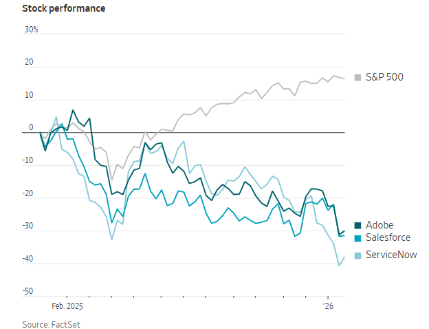 受到“氛围编程”(即使用人工智能工具快速开发应用程序和网站)兴起的冲击,软件行业巨头Salesforce、Adobe和ServiceNow自去年年初以来股价均下跌至少30%。