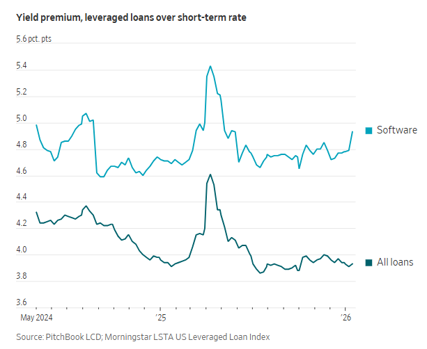 尽管软件贷款的违约率仍低于整个私募收购贷款市场的平均水平,而且投资者尚未彻底撤出这一行业,但据PitchBook LCD的数据,在过去15个月中,软件贷款相较短期基准利率的风险溢价已有所上升,而整体贷款的溢价却在下降。