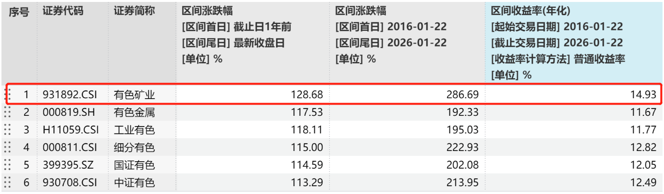 从历史表现来看,有色金属矿业指数近一年涨幅达128.68%,在主流有色指数中位居第一,近十年年化涨幅14.93%,同样显著领先。