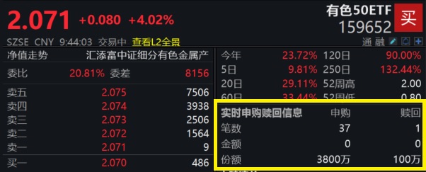 1月26日,有色金属集体爆发!有色50ETF(159652)飙涨超4%,再创历史新高,资金汹涌涌入有色板块,开盘仅10分钟,有色50ETF(159652)疯狂“吸金”超7000万元,此前已经连续2日强势吸金超1.6亿元。