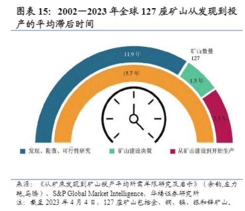 华福证券进一步指出,全球矿山资本开支历史性不足的现实约束,是开启有色行情的基础。2024年,全球主要固体矿产勘查投入持续下降至124.8亿美元,同比下降3.3%;全球主要固体矿产钻探活动延续下行趋势,钻探项目总量和钻孔总数同比分别下降19.9%、15.3%;全球40大矿企的资本开支整体弹性平稳。且金属矿山的开发周期长,下图统计的127座矿山从发现到商业生产的平均时间为15.7年。叠加矿山品味下降、矿山突发事故等因素考虑,金属矿产的供给端存在一定刚性约束。