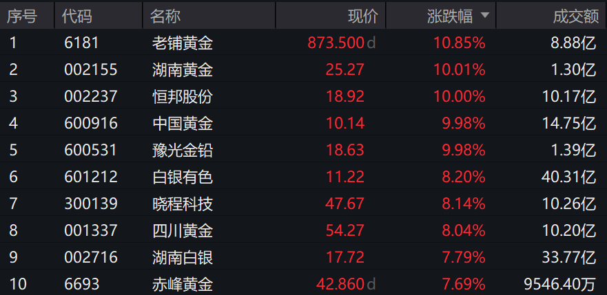 截至2026年1月26日 09:53,中证沪深港黄金产业股票指数(931238)强势上涨5.53%,成分股湖南黄金、恒邦股份、中国黄金、豫光金铅涨停,老铺黄金涨超10%,白银有色、晓程科技等个股跟涨。