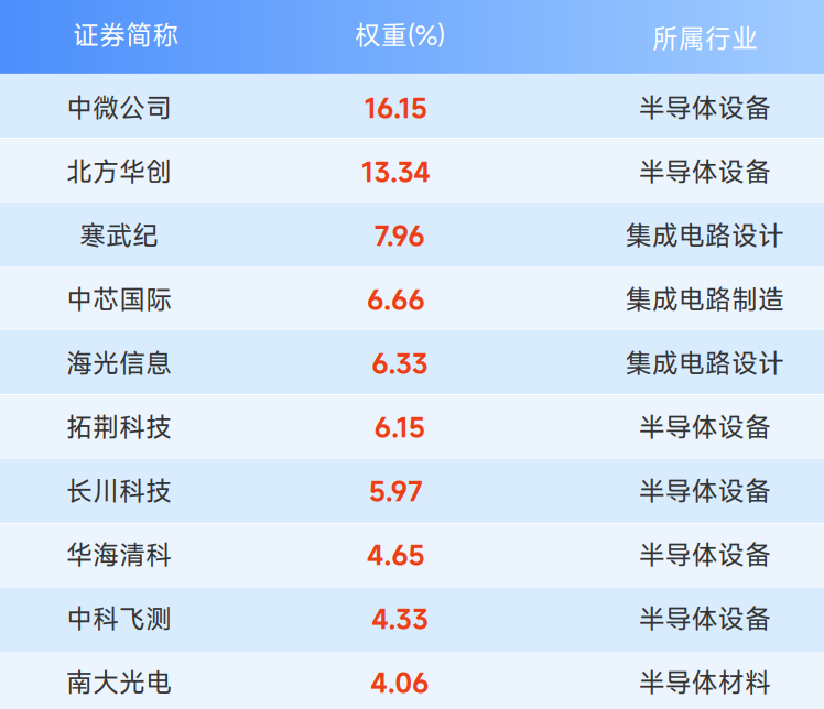 截至1月19日,该指数前十大集中度接近80%,龙头含量在同类指数中位居第一,重点覆盖中微公司(刻蚀设备)、北方华创(多领域设备)、中芯国际(制造龙头)、海光信息、寒武纪(AI芯片设计)、南大光电(半导体材料)等细分龙头,后续有望持续受到市场与政策重点关注。