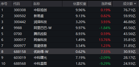 云计算ETF汇添富(159273)标的指数热门股多数飘红:网宿科技涨超13%,优刻得-W涨超7%,润泽科技涨超3%,浪潮信息涨超1%,中际旭创、新易盛、腾讯控股微涨。下跌方面,阿里巴巴-W跌近2%