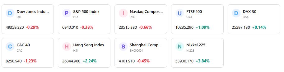 关键事件分析:2025年第四季度财报季步入高潮,Netflix、强生、宝洁和英特尔等主要公司发布了业绩。早期迹象显示表现强劲,绝大多数公司的每股收益(EPS)和营收均超过预期,表明增长趋势正在加速。围绕“格陵兰危机”的地缘政治事态发展及随后关税威胁的解除是市场的核心驱动因素。