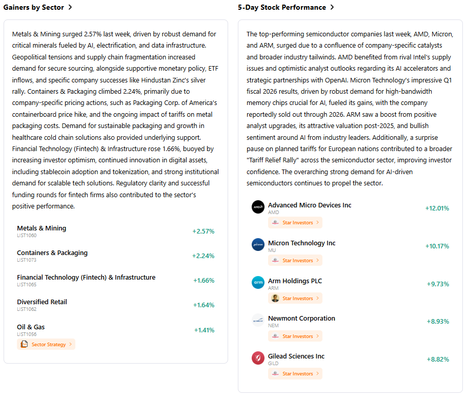 综合评估:本周的特征是强劲的经济基本面和企业财报与显著的地缘政治不确定性之间的拉锯战。市场最初对贸易关税和美联储领导层问题的焦虑,随着贸易言论的降温而有所缓解。尽管存在日内波动,但在积极的盈利势头和稳定的通胀数据支撑下,整体市场表现出了韧性。
