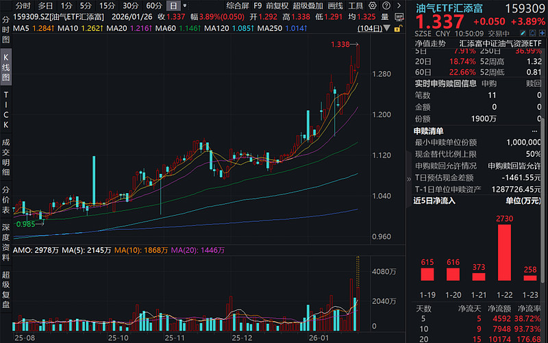 1月26日,资源板块领衔冲高,油气板块震荡上行,截至10:48,油气ETF汇添富(159309)涨超3.8%,盘中价创历史新高,资金持续涌入油气板块,油气ETF汇添富(159309)盘中吸金超2500万元!至此已经连续10日吸金超1亿元!