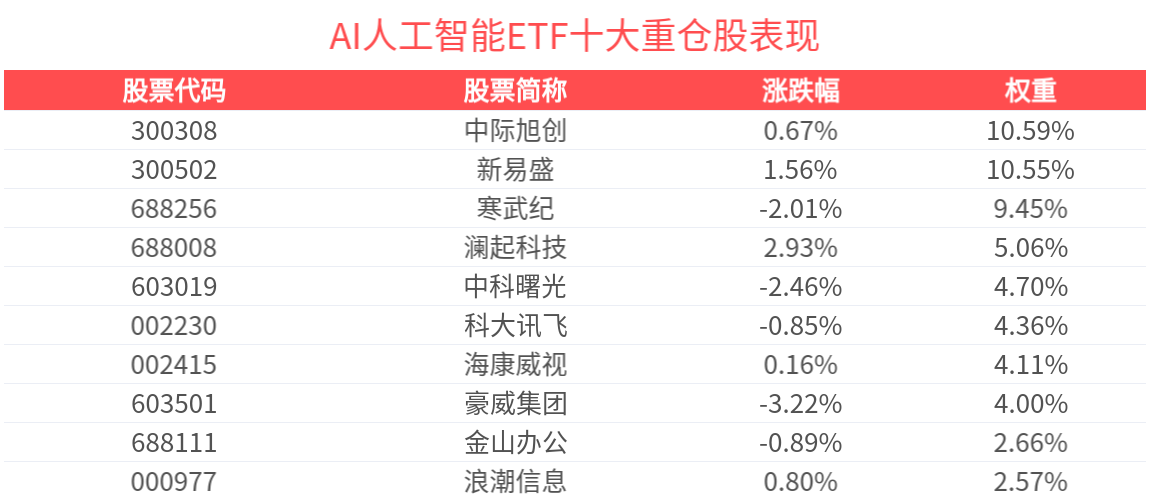 数据显示,截至2025年12月31日,中证人工智能主题指数(930713)前十大权重股分别为中际旭创、新易盛、寒武纪、澜起科技、中科曙光、科大讯飞、海康威视、豪威集团、金山办公、浪潮信息,前十大权重股合计占比58.08%。(以上所列股票仅为指数成份股,无特定推荐之意)