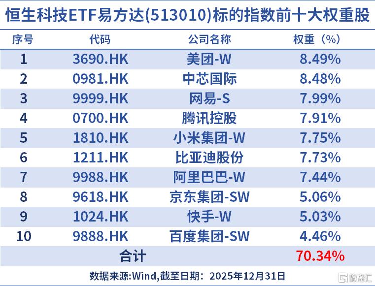 恒生科技ETF易方达(513010)跟踪恒生科技指数,精选30家港股科技龙头,均衡覆盖互联网平台、半导体、新能源汽车等硬科技赛道,前十大重仓股覆盖美团、中芯国际、腾讯控股、小米集团、网易、阿里巴巴、比阿迪股份、京东、快手和百度等科技龙头,AI相关企业占比超60%,把握全球AI产业变革机遇。