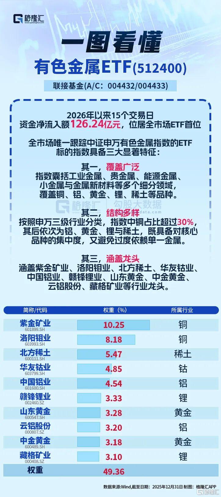 2026年以来,仅15个交易日,有色金属ETF(512400)获得126.24亿元资金净流入,位居全市场ETF首位。