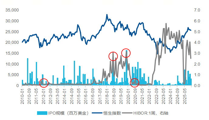 然而,若正逢港币处于强势阶段,如2020年11月至2021年6月,香港金融管理局向市场注入充裕流动性,在此背景下,尽管大规模IPO申购短期内形成了明显的资金锁定效应(彼时多只IPO认购倍数超过千倍,如快手-W上市期间冻资规模逾1.2万亿港元),但HIBOR整体仍维持在低位或呈现下行趋势,反映出市场流动性整体保持宽松。