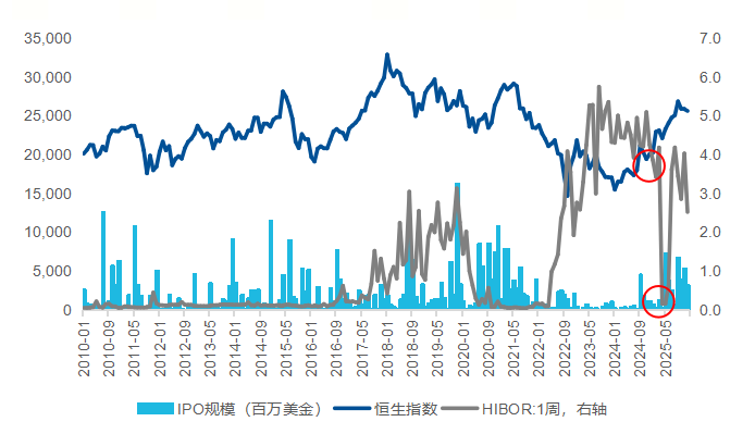 2023年11月FINI系统启用后,投资者参与公开发售认购不再需要缴纳全额认购额,实际的冻资规模将低于用全额认购资金计算的冻资规模。25年以来港股IPO募集规模明显扩大,尤其在25Q1,布鲁可、蜜雪集团的公开发售有效认购倍数分别达到了6000倍、5258倍,公开发售认购总规模分别达到0.9万亿、1.8万亿(但由于FINI系统,实际冻资规模将明显低于总认购规模),但HIBOR短端利率仍平稳向下。甚至在25年5月,IPO募资规模由上月的约30亿港币提升至超550亿,再加上企业分红回购、南向与外资流入共同影响下,港元需求十分强劲,触及7.75强方兑换保证水平。为此,香港金管局于5月初向银行间市场注资约1294亿港元,释放流动性,促使HIBOR大幅回落至历史低位,而恒生综指在5月收涨超过5%。由此可见,港股IPO在特定条件下不仅不会导致市场走熊,甚至可能会由于市场对于港元的需求激增,促进流动性的释放,降低HIBOR利率,进一步提振港股的上行。