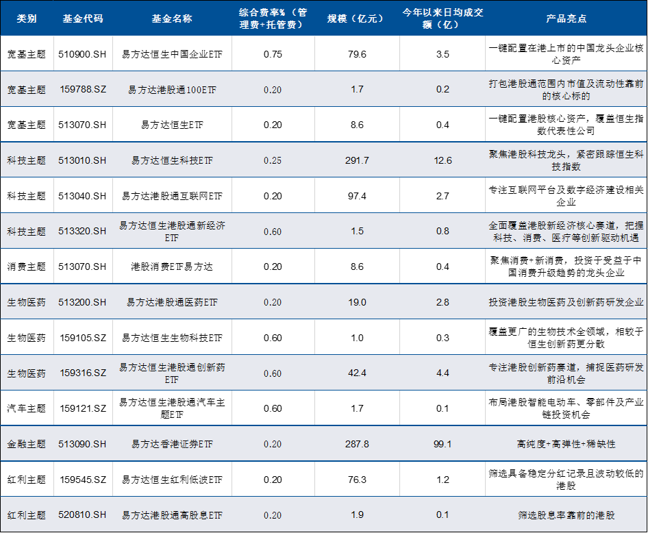 易方达基金旗下主要投资于港股类的产品管理规模达到919亿元。目前,公司已布局14只港股相关ETF,覆盖宽基指数、核心行业(互联网、医药、消费、汽车、证券)、红利策略等多个方向,为投资者提供丰富工具选择。