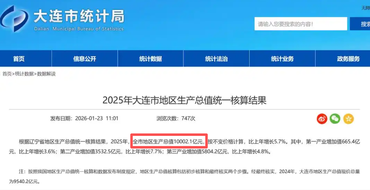 根据辽宁省大连市统计局发布的消息,2025年大连市实现地区生产总值10002.1亿元,按不变价格计算同比增长5.7%,压线成为中国东北地区首个GDP突破万亿元的城市。