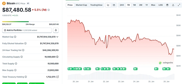 虽然贵金属价格飞涨,但加密市场却并不乐观。BTC价格报87480.58美元,7日跌幅5.5%。ETH价格报2863.18美元,7日跌幅10.6%。