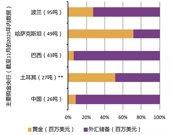 (截至2025年11月,主要购金央行的黄金储备情况 来源:世界黄金协会)