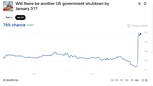 1月10日,特朗普表示:1月30日可能再次发生美国政府关门事件。据1月26日的Polymarket 数据显示,交易员预测美国政府在 1 月底前再次关门的可能性达到 78%,该概率在过去 24 小时内上升 68%。
