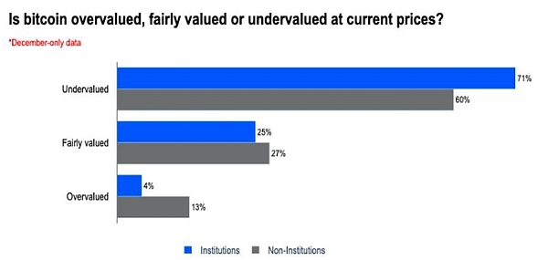 Coinbase在其 2026 年第一季度加密货币走势报告中指出,其于 12 月初至 1 月初期间对 75 家机构投资者和 73 家独立投资者进行的调查发现,71% 的机构投资者和 60% 的独立投资者“认为比特币被低估”。