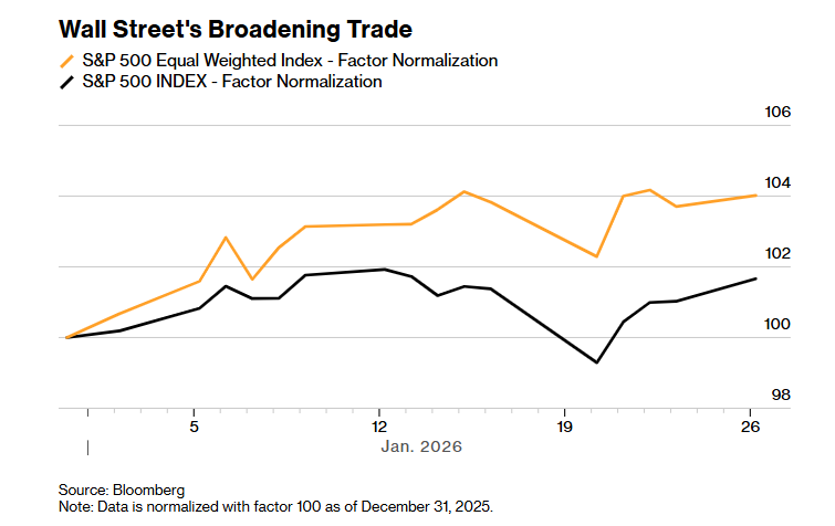 事实上,2026年初的市场表现已显示出股票板块的扩张。标普500指数今年累计上涨1.5%,而等权重版本涨幅约为4%。