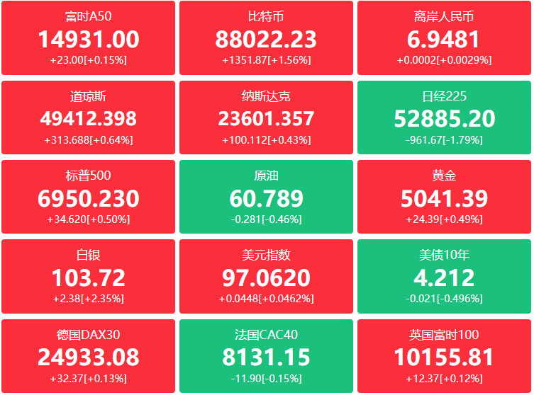 外盘:投资者聚焦企业财报及美联储货币政策决议,美股集体收涨,其道指涨313.69点,涨幅0.64%报49412.40点;纳指涨100.11点,涨幅0.43%报23601.36点;标普500指数涨34.62点,涨幅0.50%报6950.23点;科技股涨跌互现,苹果、甲骨文、Meta涨超2%,英特尔跌超5%,AMD、特斯拉跌超3%;中概股多数下跌,纳斯达克中国金龙指数收跌0.62%,百度跌超3%,小鹏汽车跌超2%,阿里巴巴跌超1%,理想汽车涨超1%。