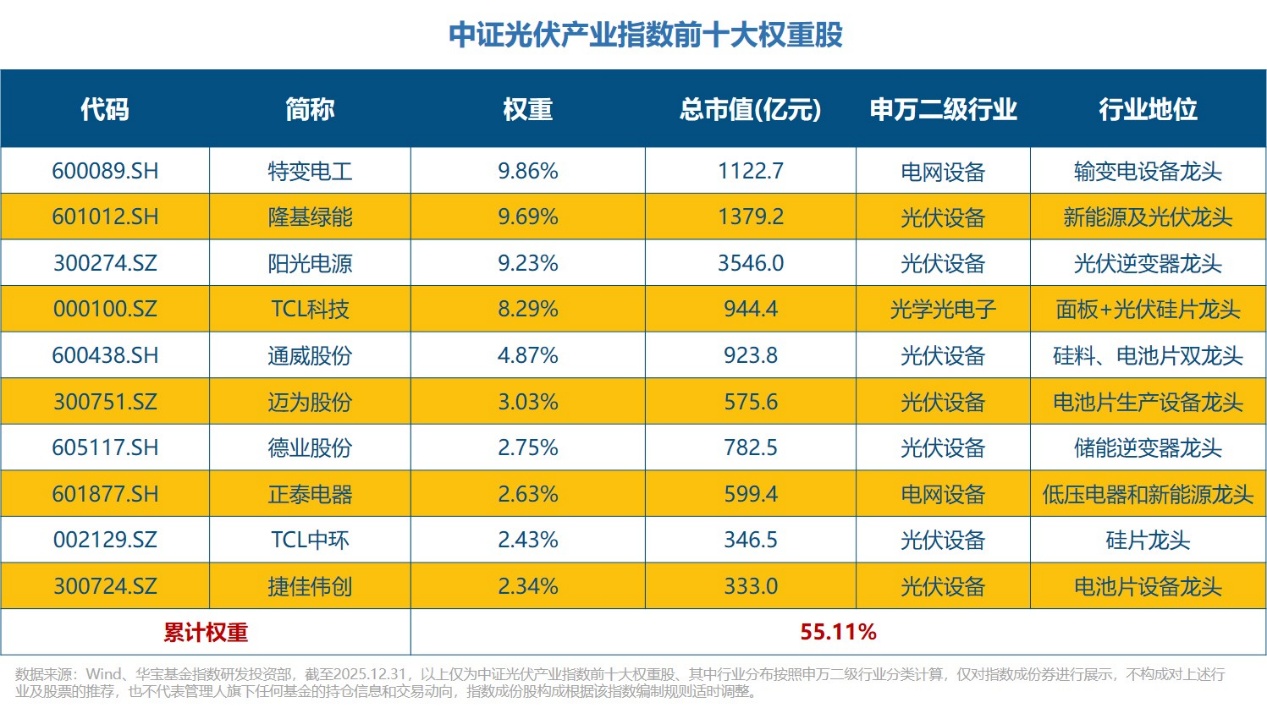 详细来看,中证光伏产业指数汇聚产业链龙头,截至2025年12月31日,指数成份股共50只,前五大权重股占比41.9%,前十大权重股占比55.11%,形成“龙头引领 中坚支撑”的均衡结构。