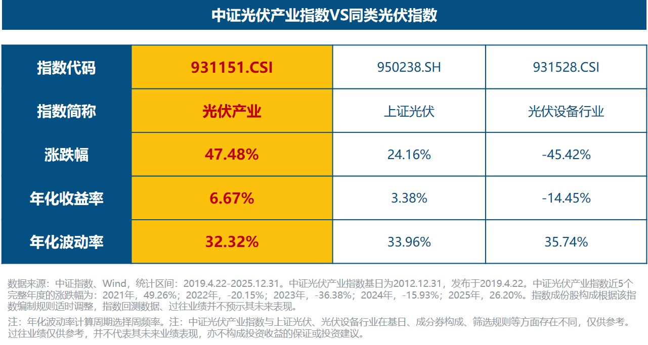 自指数发布日2019年4月22日至2025年12月31日,中证光伏产业指数累计收益率为47.48%,年化收益率为6.67%,均高于沪深300指数,且同期表现同样优于上证光伏指数及光伏设备行业指数,年化波动率更低,风险收益特征相对更优。