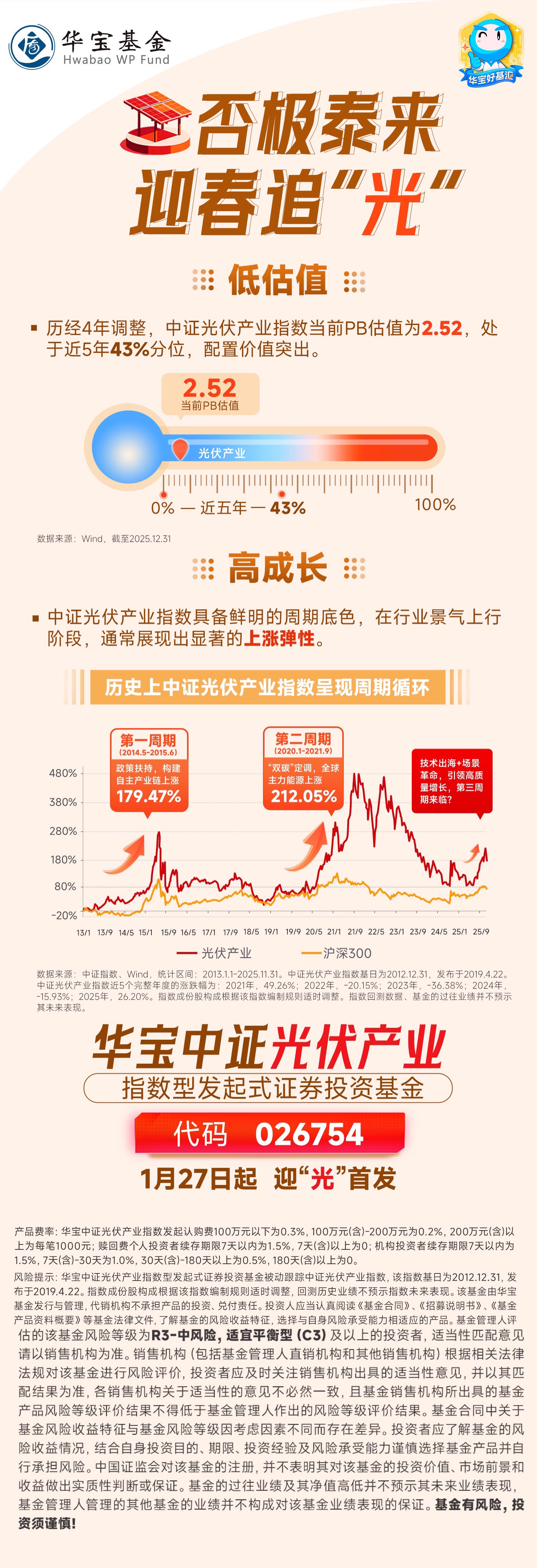 风险提示:华宝中证光伏产业指数型发起式证券投资基金被动跟踪中证光伏产业指数,该指数基日为2012.12.31,发布于2019.4.22。指数成份股构成根据该指数编制规则适时调整,回测历史业绩不预示指数未来表现。该基金由华宝基金发行与管理,代销机构不承担产品的投资、兑付责任。投资人应当认真阅读《基金合同》、《招募说明书》、《基金产品资料概要》等基金法律文件,了解基金的风险收益特征,选择与自身风险承受能力相适应的产品。基金管理人评估的该基金风险等级为R3-中风险,适宜平衡型(C3)及以上的投资者,适当性匹配意见请以销售机构为准。销售机构(包括基金管理人直销机构和其他销售机构)根据相关法律法规对该基金进行风险评价,投资者应及时关注销售机构出具的适当性意见,并以其匹配结果为准,各销售机构关于适当性的意见不必然一致,且基金销售机构所出具的基金产品风险等级评价结果不得低于基金管理人作出的风险等级评价结果。基金合同中关于基金风险收益特征与基金风险等级因考虑因素不同而存在差异。投资者应了解基金的风险收益情况,结合自身投资目的、期限、投资经验及风险承受能力谨慎选择基金产品并自行承担风险。中国证监会对该基金的注册,并不表明其对该基金的投资价值、市场前景和收益做出实质性判断或保证。基金的过往业绩及其净值高低并不预示其未来业绩表现,基金管理人管理的其他基金的业绩并不构成对该基金业绩表现的保证。基金有风险,投资须谨慎!