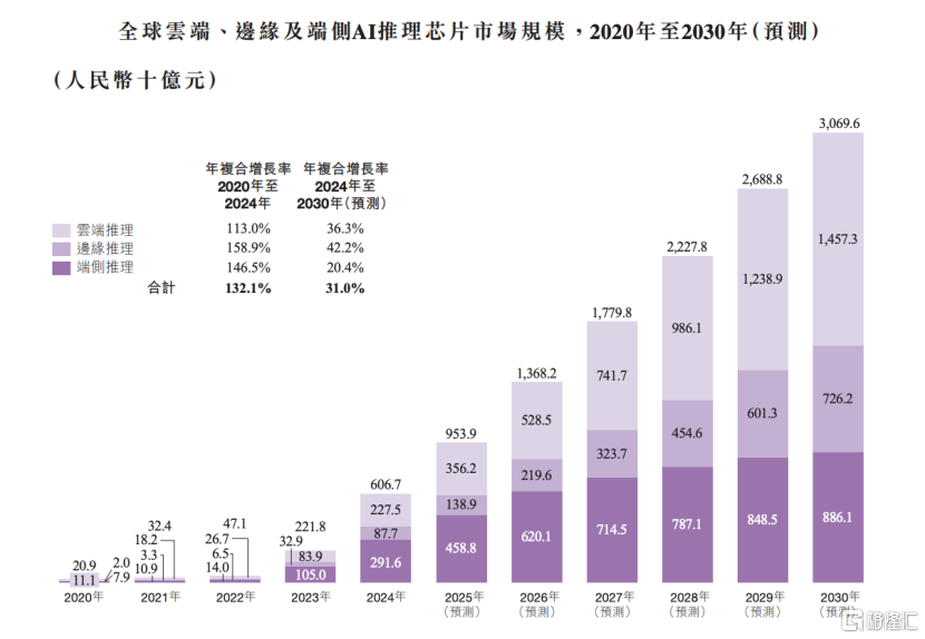 根据招股书披露,2024年,全球AI推理芯片市场规模总额达人民币6067亿元,其中云端推理、边缘推理及端侧推理芯片分别占人民币2275亿元、877亿元及2916亿元。预计到2030年,云端推理、边缘推理及端侧AI推理芯片市场规模分别达到人民币14573、7262、8861亿元,2024年至2030年的年复合增长率分别为36.3%、42.2%、20.4%。