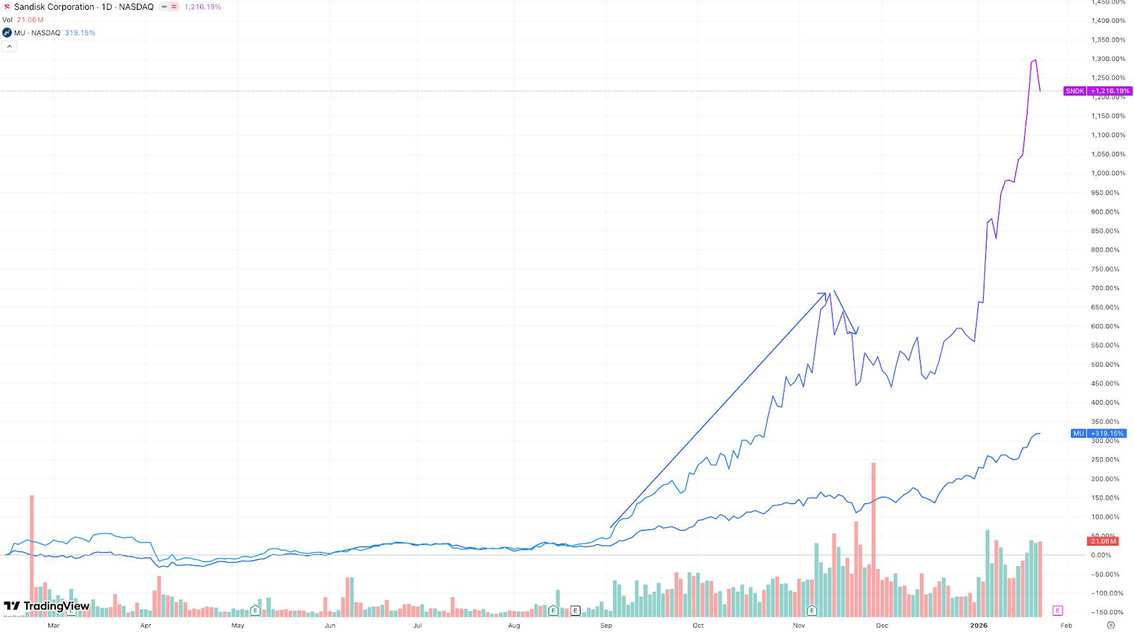 【SanDisk上市以来股价走势(对比美光MU),来源:TradingView】