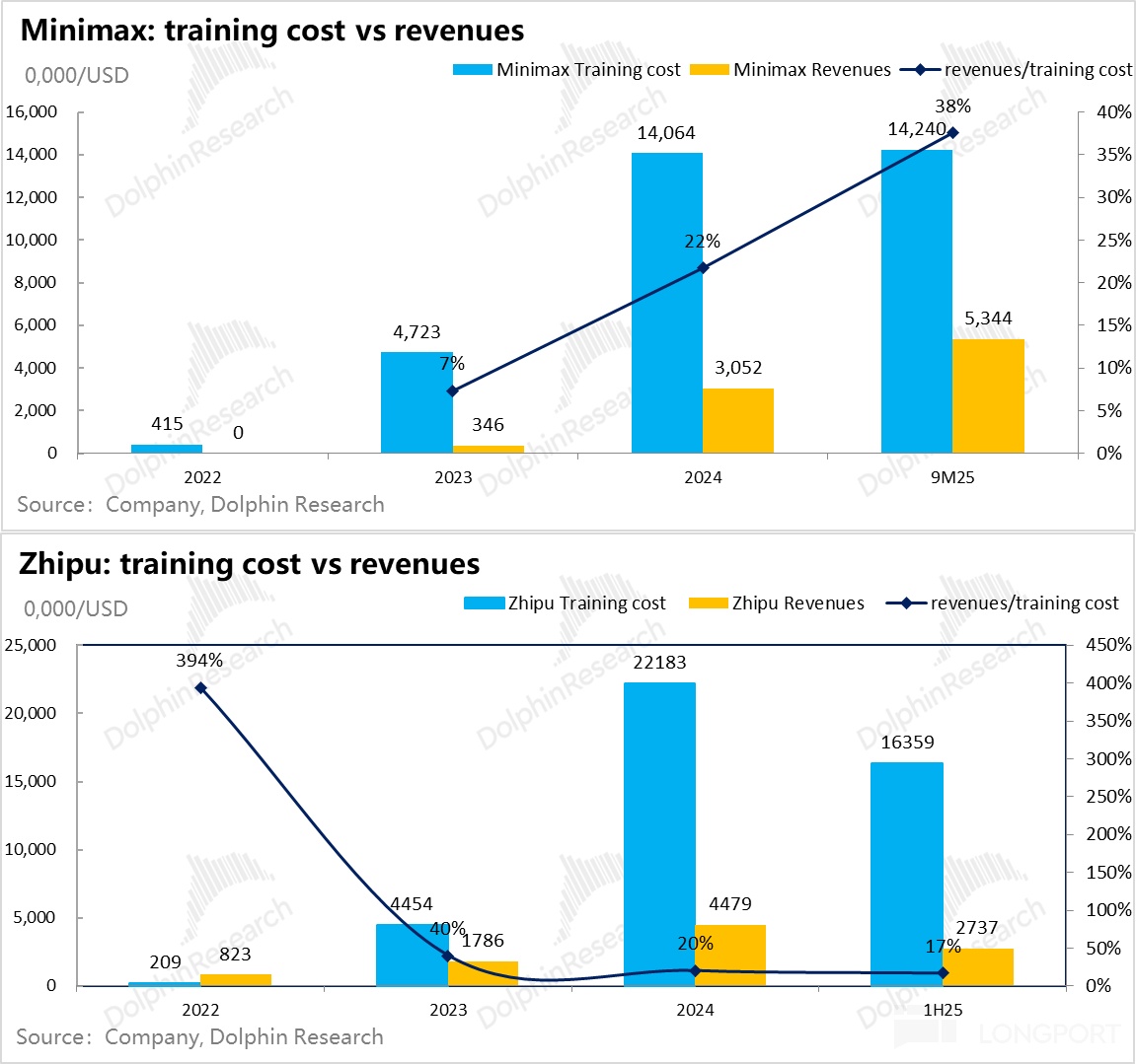 从 Minimax 来看,2024 年创收只有 23 年模型训练算力投入的 65%,25 年前三季度虽然收入成长很快,但也对 24 年同期训练算力成本覆盖能力反而进一步降低到了 50%;智谱到 25 年上半年更是仅有 30% 的覆盖率。