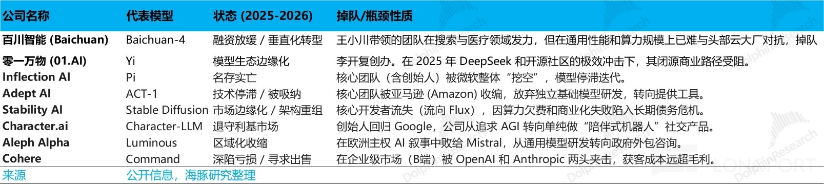 过去一年中,多数独立创业公司,要么在与互联网大厂竞争中被挖走了人,要么产品落地上创收困难,要么是模型价格比拼中,干不过性价比高的开源模型,模型倒在了半路上。