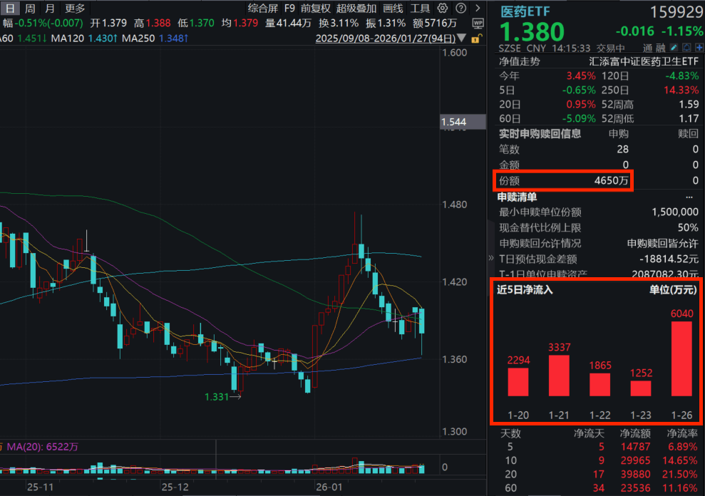 资料显示,医药ETF(159929)所跟踪的中证医药卫生指数(000933)全面覆盖医药板块细分领域。数据显示,截至2026年1月23日,中证医药卫生指数(000933)前十大权重股合计占比42.97%。