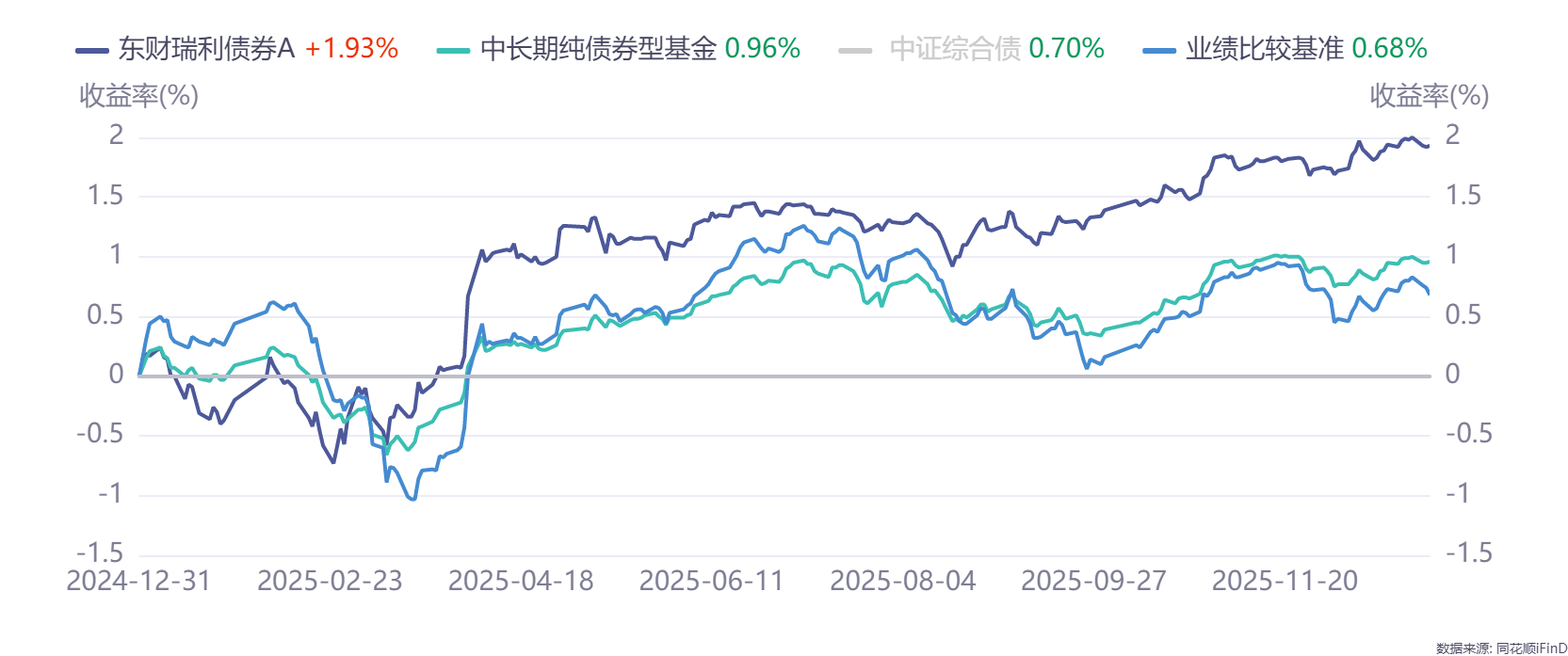 图:东财瑞利债券A(018444)2025年收益率与中长期纯债收益指数对比