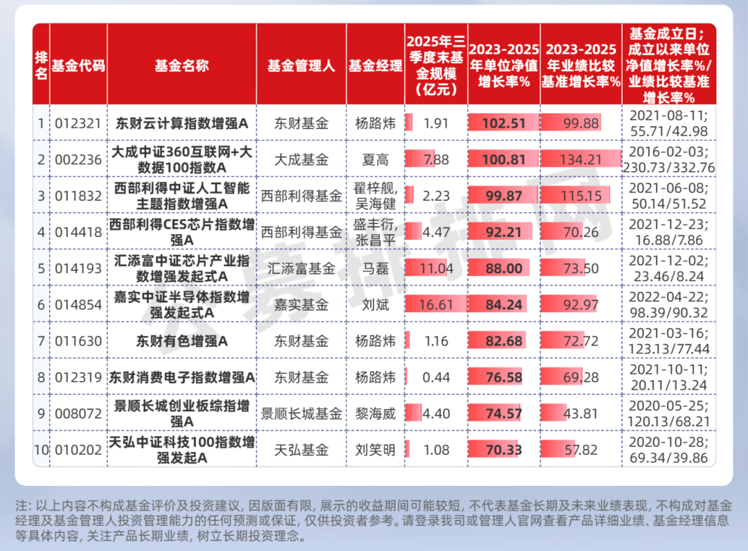在指数增强领域,东财基金同样展现出量化投研实力。据公募排排网, 2023-2025年有业绩展示的326只指数增强型量化基金中,东财有色增强、东财云计算指数增强、东财消费电子指数增强三只产品均进入三年业绩榜前十,其中东财云计算指数增强居榜首。在市场景气度上行时为投资者提供了兼顾行业β与量化挖掘超额α的机会。