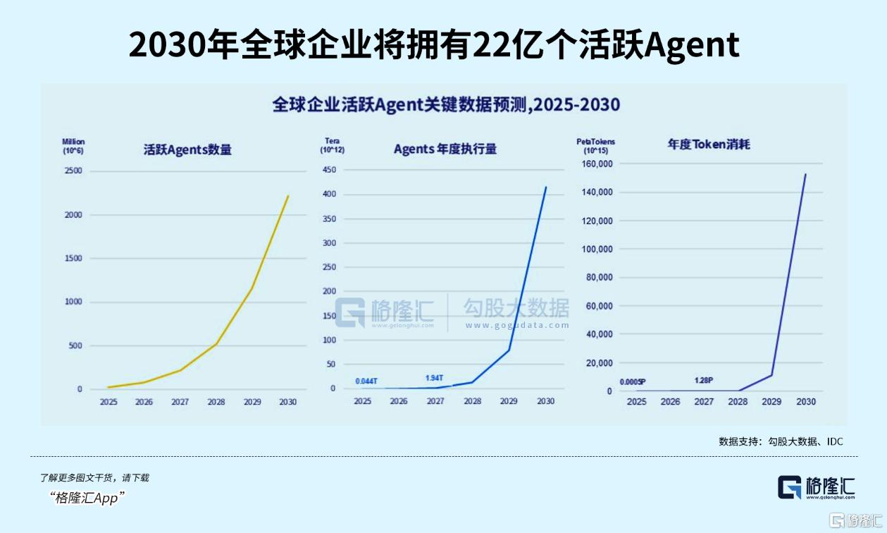 根据IDC预测,2025年到2030年,全球活跃Agent数量将从2860万暴涨至22.16亿,年复合增长率高达139%;年度任务执行量将从440亿次飙升至415万亿次,年复合增长率524%;而Token消耗量的年复合增长率更是达到惊人的3418%。