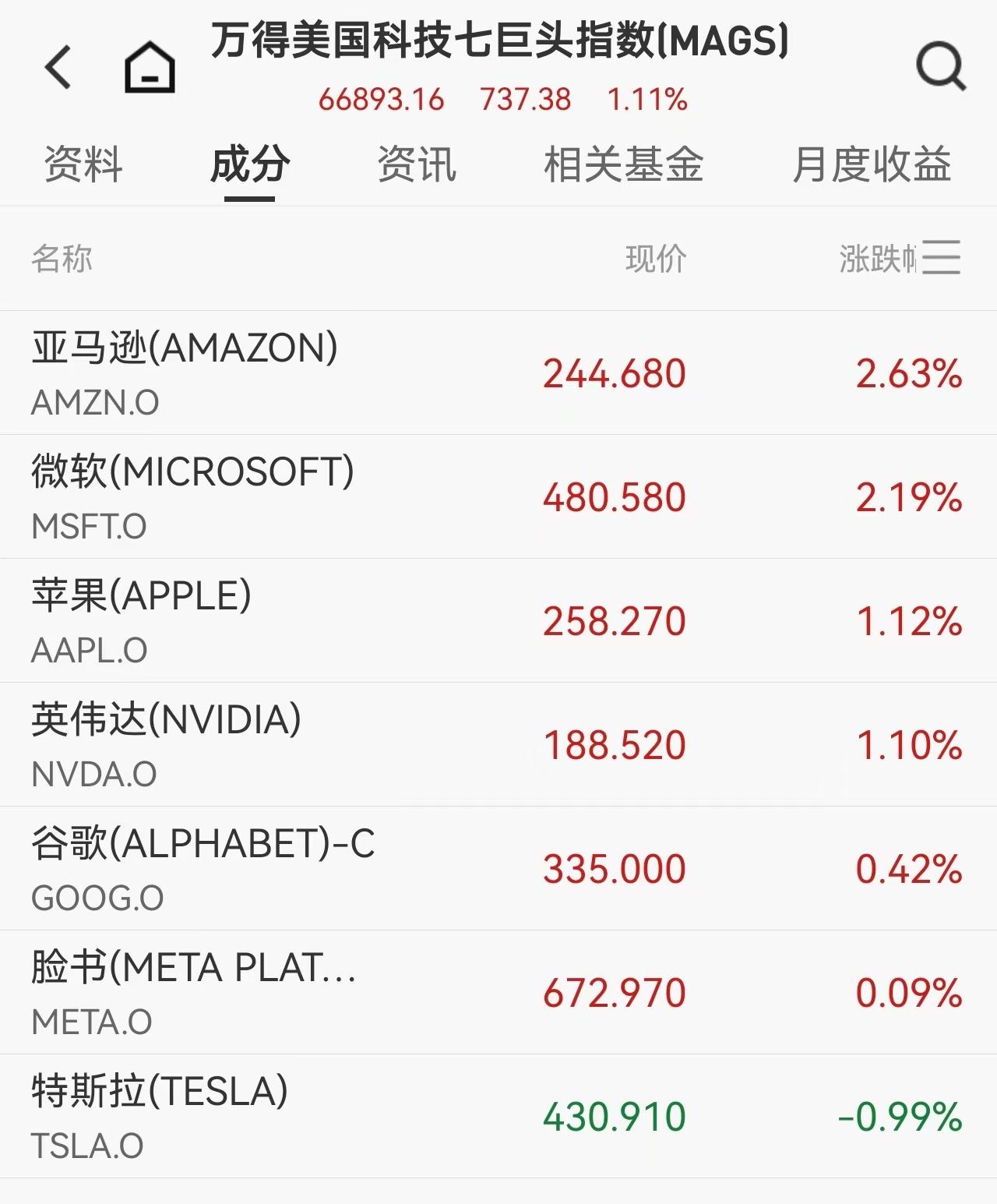 科技巨头成为市场主导力量。万得美国科技七巨头指数上涨1.11%,其中亚马逊、微软涨幅均超2%,苹果、英伟达涨超1%,仅特斯拉微跌0.99%。