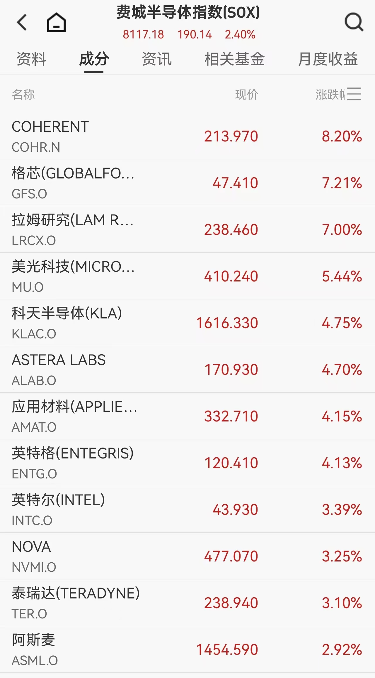 半导体板块表现尤为亮眼,费城半导体指数大涨2.40%,自2025年12月中旬以来累计涨幅已超16%。成分股中COHERENT涨超8%,格芯、拉姆研究涨超7%,美光科技涨超5%。