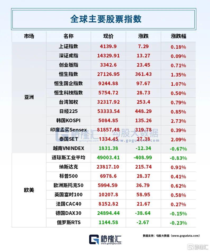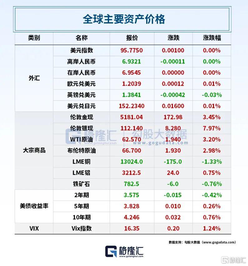 全球资产表现上,国际油价走高,WTI原油期货收报62.57美元/桶,涨幅3.20%。布伦特原油期货收报66.70美元/桶,涨幅2.98%。现货黄金涨3.45%,报5181.04美元/盎司,最高触及5190.06美元/盎司创历史新高。现货白银涨7.97%%,报112.14美元/盎司