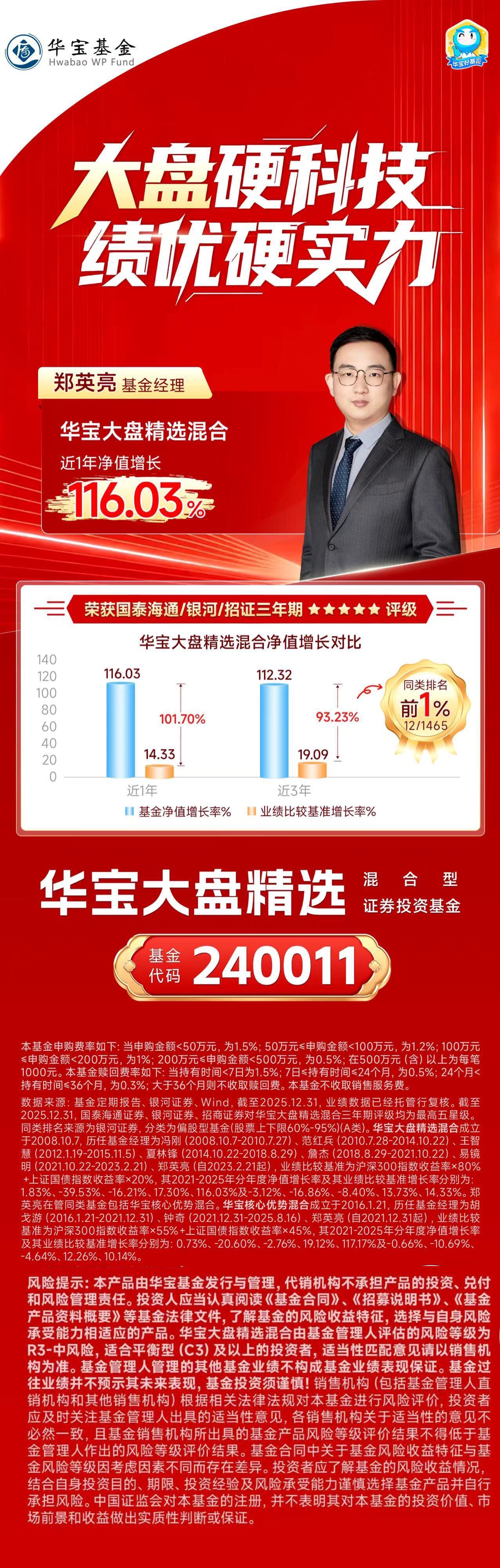 据悉,在华宝优势产业这只新基金发行之前,郑英亮就已凭借卓越的投资业绩,在强手如林的公募基金主动权益投资领域赢得声名。日前,公募基金2025年四季报披露完毕,郑英亮在管的2只基金华宝核心优势灵活配置混合型基金(A类002152;C类016461)、华宝大盘精选混合型基金(240011)双双在2025年内斩获翻倍的投资回报,为持有人带来丰厚收益,其中华宝核心优势A(002152)、华宝核心优势C(016461)2025年度净值增长率分别为117.17%、115.98%,华宝大盘精选(240011)2025年度净值增长率为116.03%,2只基金均大幅跑赢业绩基准100个百分点以上。