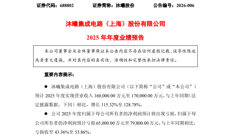 业绩预告显示,2025年1月1日至12月31日期间,沐曦股份预计实现营业收入16亿元至17亿元,较上年同期的7.43亿元增长115.32%至128.78%,对应增加营收8.57亿元至9.57亿元,收入规模实现跨越式提升。