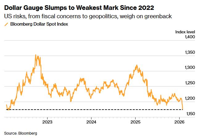TradingKey - 美元正遭遇近四年来最猛烈的一轮抛售潮,彭博美元指数周二跌至2022年3月以来最低水平。