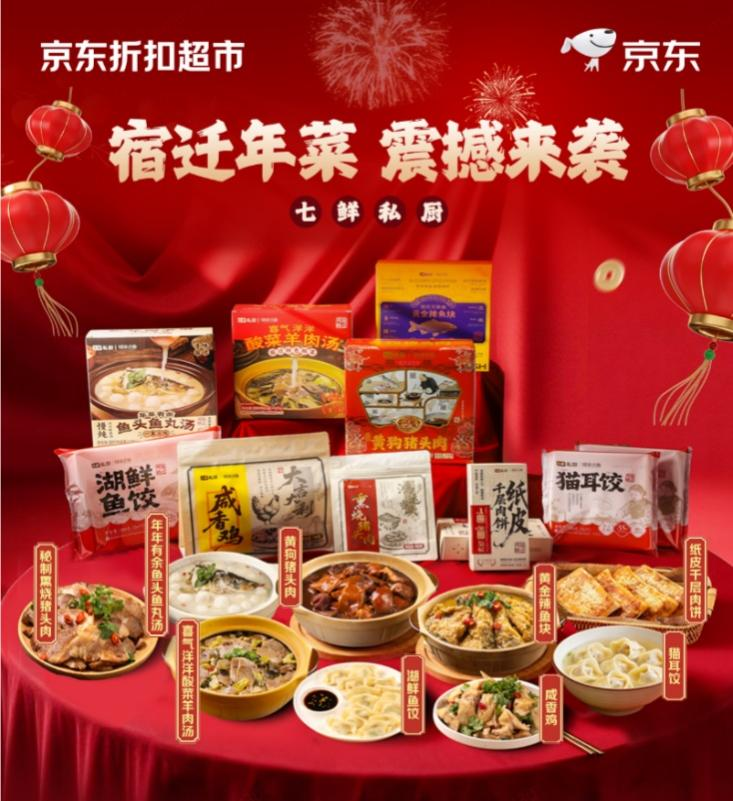除了备受瞩目的金钞大奖外,为让各地消费者都能买到专属年味,京东折扣超市结合本地饮食文化打造特色好物。例如,京东折扣超市联合七鲜私厨推出江苏宿迁独有的“家宴年夜饭”系列,包含非物质文化遗产黄狗猪头肉、黄金辣鱼块、酸菜羊肉汤、一鱼三吃的鱼头鱼丸汤、咸香鸡、熏烧猪头肉、纸皮千层肉饼、湖鲜鱼饺、猫耳饺等九道特色年菜,涵盖肉禽、湖鲜、面点、汤品四大品类。