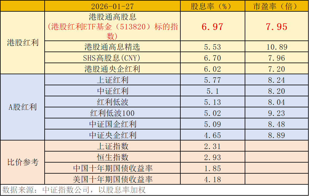 100%纯粹高股息,港股红利“权威经典之选”。港股红利ETF基金(513820)标的指数采用“100%纯粹”高股息选股策略,“大道至简”,纯粹高股息策略往往能“穿越周期”,应对复杂多变的市场风格。截至1月27日,港股红利ETF基金(513820)标的指数股息率达6.97%,领先A股、港股同类指数,为全市场港股红利名副其实的权威“金标准”