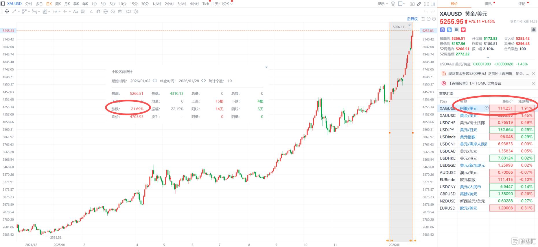截至目前的近一个月,黄金累涨超21%,本月来累计涨超900美元;白银更甚,累计涨幅近60%。