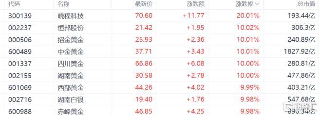A股掀涨停潮。白银有色7连板、四川黄金10天6板、招金黄金8天5板、中国黄金4连板、湖南黄金3连板,西部黄金6天3板,中金黄金3天2板。