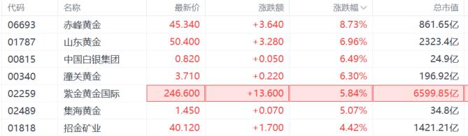 港股赤峰黄金大涨超8%,山东黄金、中国白银集团、潼关黄金涨超6%,紫金黄金国际涨超5%,招金矿业等涨超4%。