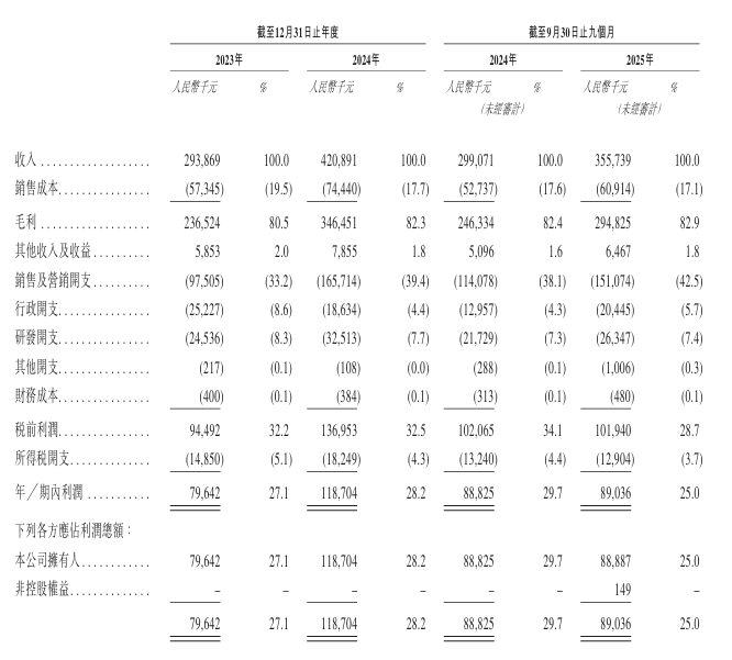 在高速增长的同时,公司展现出优异的盈利水平。其毛利率长期维持在80%以上,且呈上升趋势。净利润表现强劲,2023年、2024年及2025年前九个月分别为0.80亿元、1.19亿元和0.89亿元,净利率保持在25%以上。