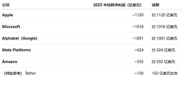 150亿美元是什么概念?也许放在科技巨头公司和国家GDP层面会更好的理解。Tether的2025年利润相当于1/4个亚马逊1/7.5个苹果公司。即便在过去 10–15 年里就强势盈利的科技巨头中,Tether 的利润也大约相当于一个中等规模科技公司的年利润。