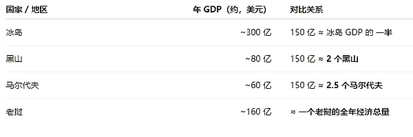 如果放在国家GDP的层面进行对比,Tether的2025年盈利规模相当于冰岛的一半、老挝的全部。如果把150 亿美元如果当成“体量”,那么Tether大致相当于全球 GDP 排名约 40–60 名左右的小型经济体水平(如一些东欧、非洲或中小型亚洲国家)。综上,Tether作为一个稳定币公司一年的利润,约等于一个中等发展中一整年的经济产出。