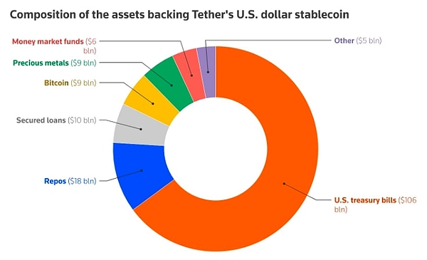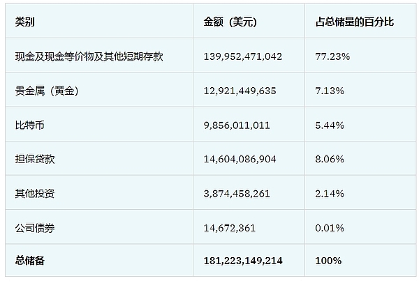 截至近两年,Tether的储备结构中:美国国债及类似高流动性资产占比超过70%,其余为贵金属与比特币等。